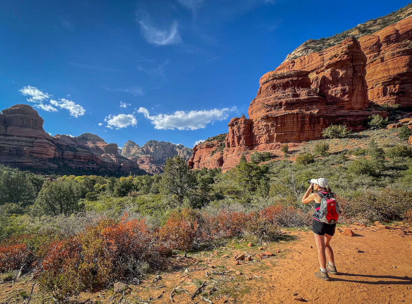 Sedona is a lush desert for various cacti ranging from tiny hedgehogs up to spiny prickly pears as you roll down the trail. However, Sedona’s hills look more like a deep forest than a desert. When you get up close, you’ll realize that the pines covering the hillsides are small, scraggly, desert pinions; nevertheless, they lend Sedona a feel more akin to a forested mountain range than a windswept desert. Adding to the lushness of Sedona is the ever-flowing Oak Creek that runs through the bottom of the valley that brings you into a radically different ecosystem filled with tall grasses, lush undergrowth, and even deciduous trees that, yes, including oaks.